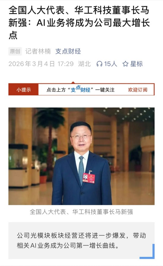 人民日?qǐng)?bào)《兩會(huì)特刊》、新華社《新華每日電訊》、證券時(shí)報(bào)、證券日?qǐng)?bào)、上海證券報(bào)、21世紀(jì)經(jīng)濟(jì)報(bào)道、每日經(jīng)濟(jì)新聞、經(jīng)濟(jì)觀察報(bào)、第一財(cái)經(jīng)、支點(diǎn)財(cái)經(jīng)、湖北日?qǐng)?bào)、長江日?qǐng)?bào)等多家媒體關(guān)注馬新強(qiáng)代表的履職情況及華工科技創(chuàng)新發(fā)展。