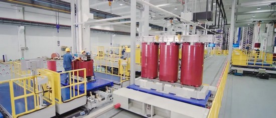 該智能工廠以全面數(shù)智化轉(zhuǎn)型為目標(biāo),將物聯(lián)網(wǎng)、云計(jì)算、大數(shù)據(jù)等新一代信息技術(shù)貫穿于設(shè)計(jì)、生產(chǎn)、管理、服務(wù)等制造環(huán)節(jié),專注生產(chǎn)電壓等級(jí) 35KV 及以下、成品重量不大于 25 噸的干式變壓器。通過(guò)對(duì)廠房一二樓合理規(guī)劃,引入 AGV 自動(dòng)輸送系統(tǒng)、RGV 自動(dòng)輸送系統(tǒng)、自動(dòng)桁架機(jī)械手等自動(dòng)化物流設(shè)備,實(shí)現(xiàn)生產(chǎn)及物料轉(zhuǎn)運(yùn)流程自動(dòng)化作業(yè),達(dá)成減人增效目標(biāo)。