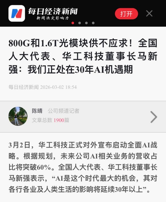 基礎(chǔ)層做強(qiáng)“硬支撐”?!?026年將是技術(shù)迭代加速之年?!瘪R新強(qiáng)預(yù)判,800G已成為業(yè)績核心主線,1.6T將全面啟動(dòng)規(guī)?;逃?,并加快3.2T/6.4T迭代。公司將通過硅光、LPO、CPO多路線并行,實(shí)現(xiàn)高端光芯片自主量產(chǎn),同時(shí)開工智能傳感器中試平臺(tái),布局具身智能等新興賽道,為全球算力提供可靠供給。